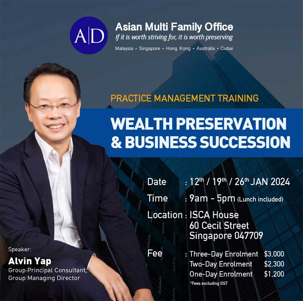 A strong believer in Preservation First, Accumulation Second and Distribution Last, Alvin injects a fresh perspective on how a family's wealth legacy and Asian values can be preserved for many generations.